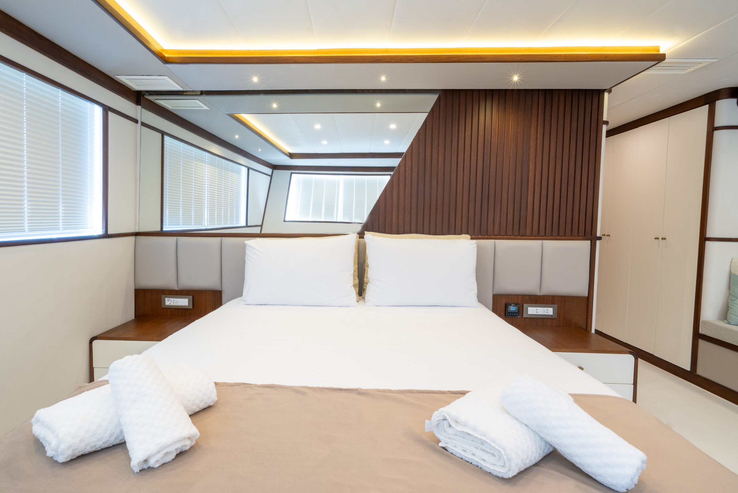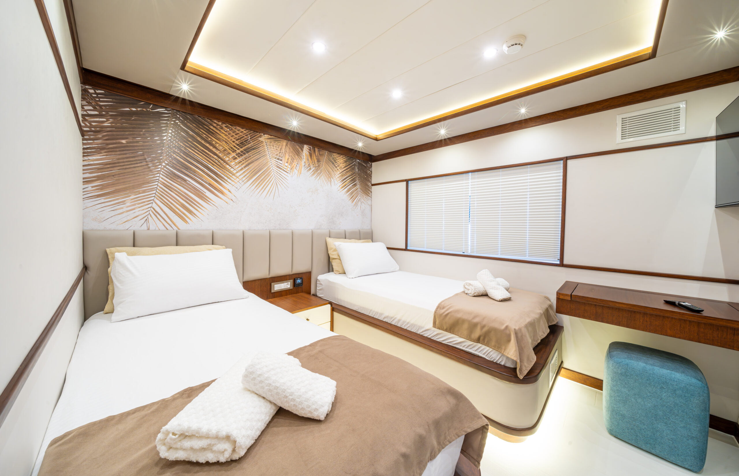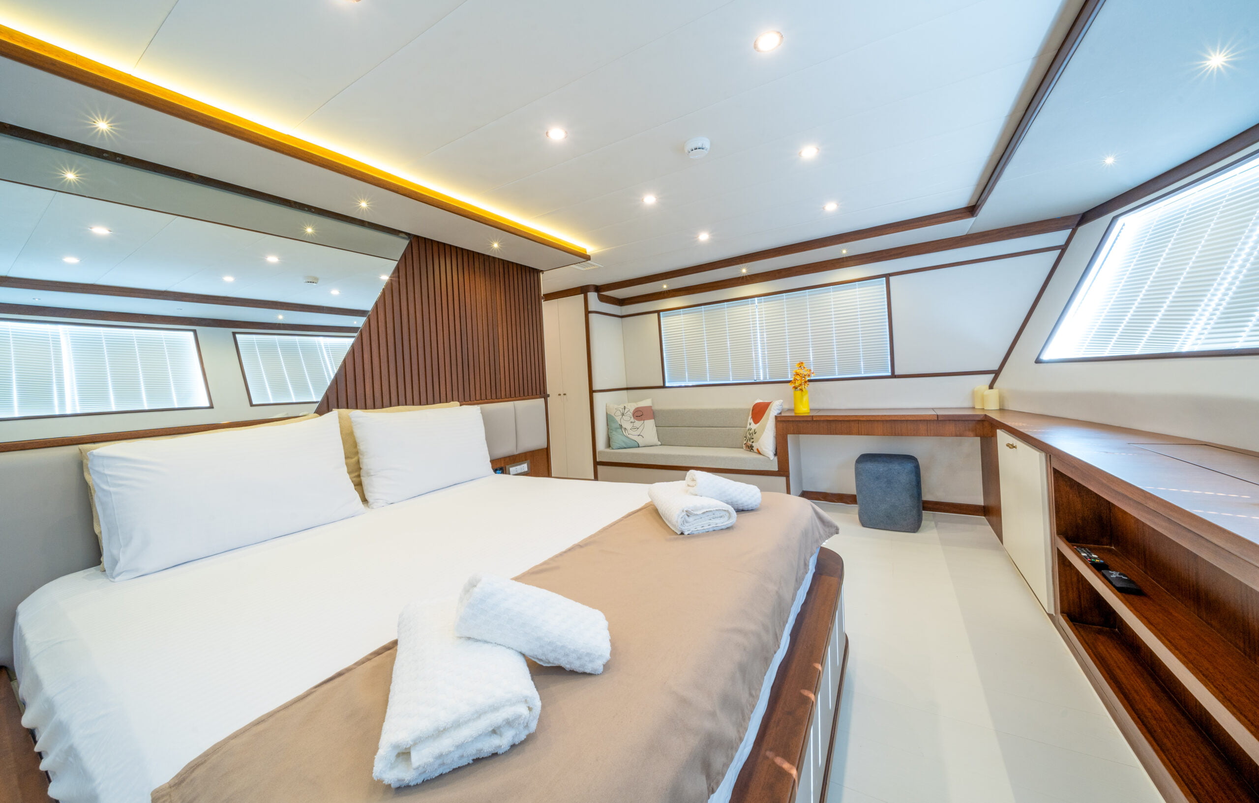 Trawler By C&F is moored in Fethiye harbour and has 4 cabins; 2 masters, 1 triple and 1 twin cabins.