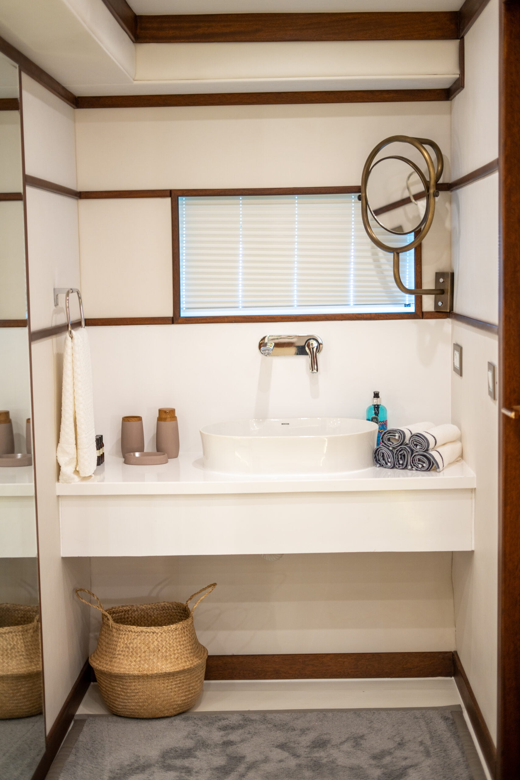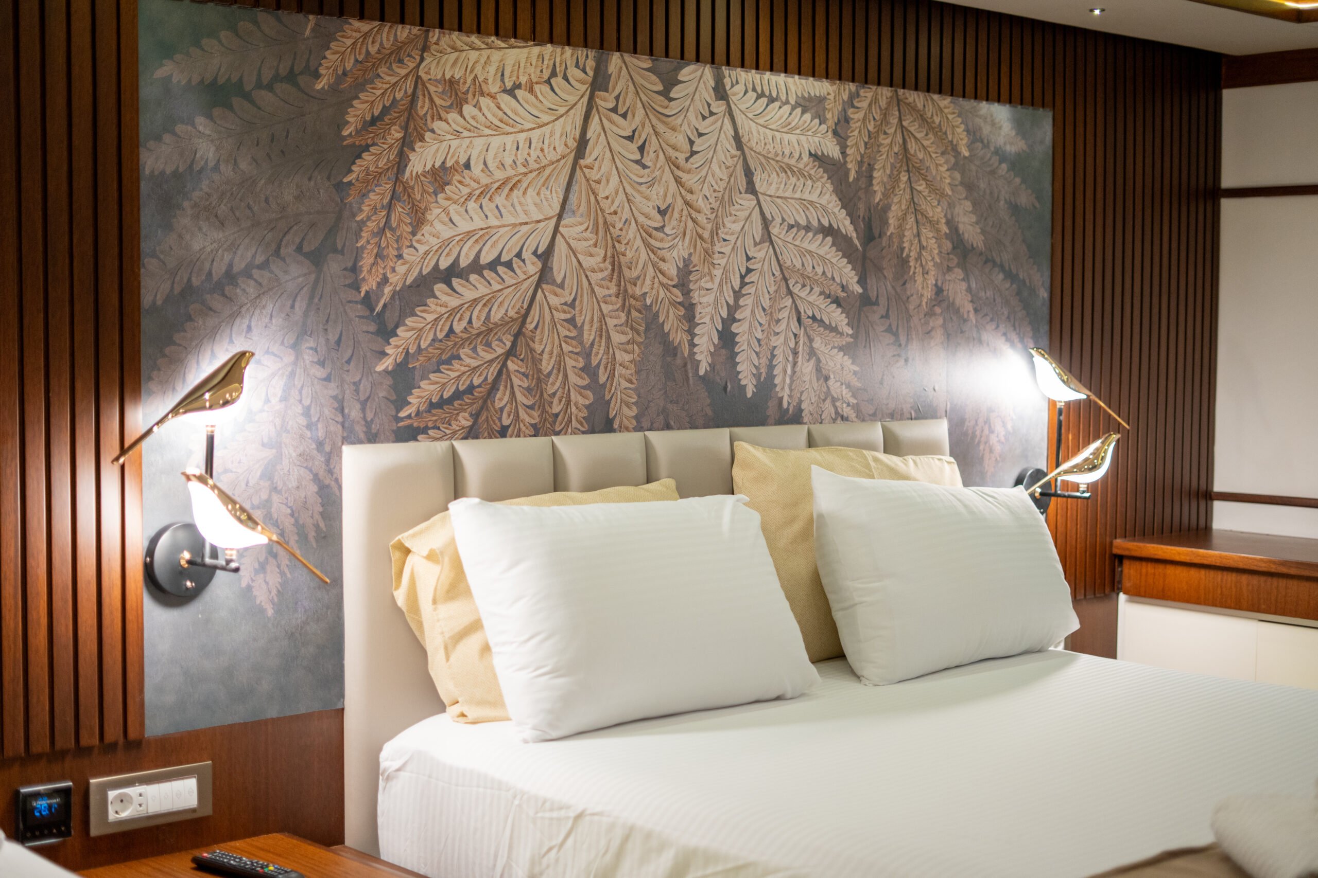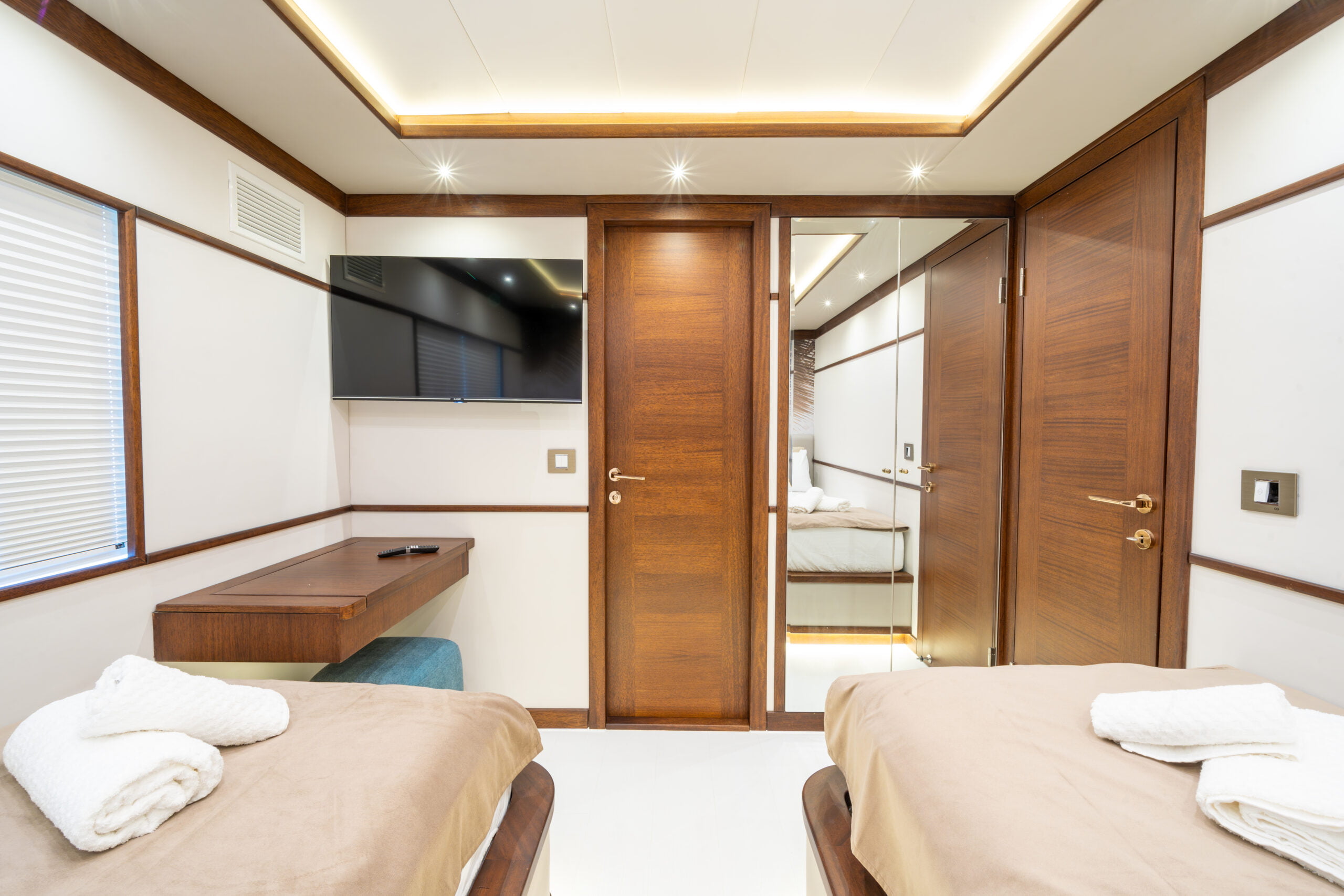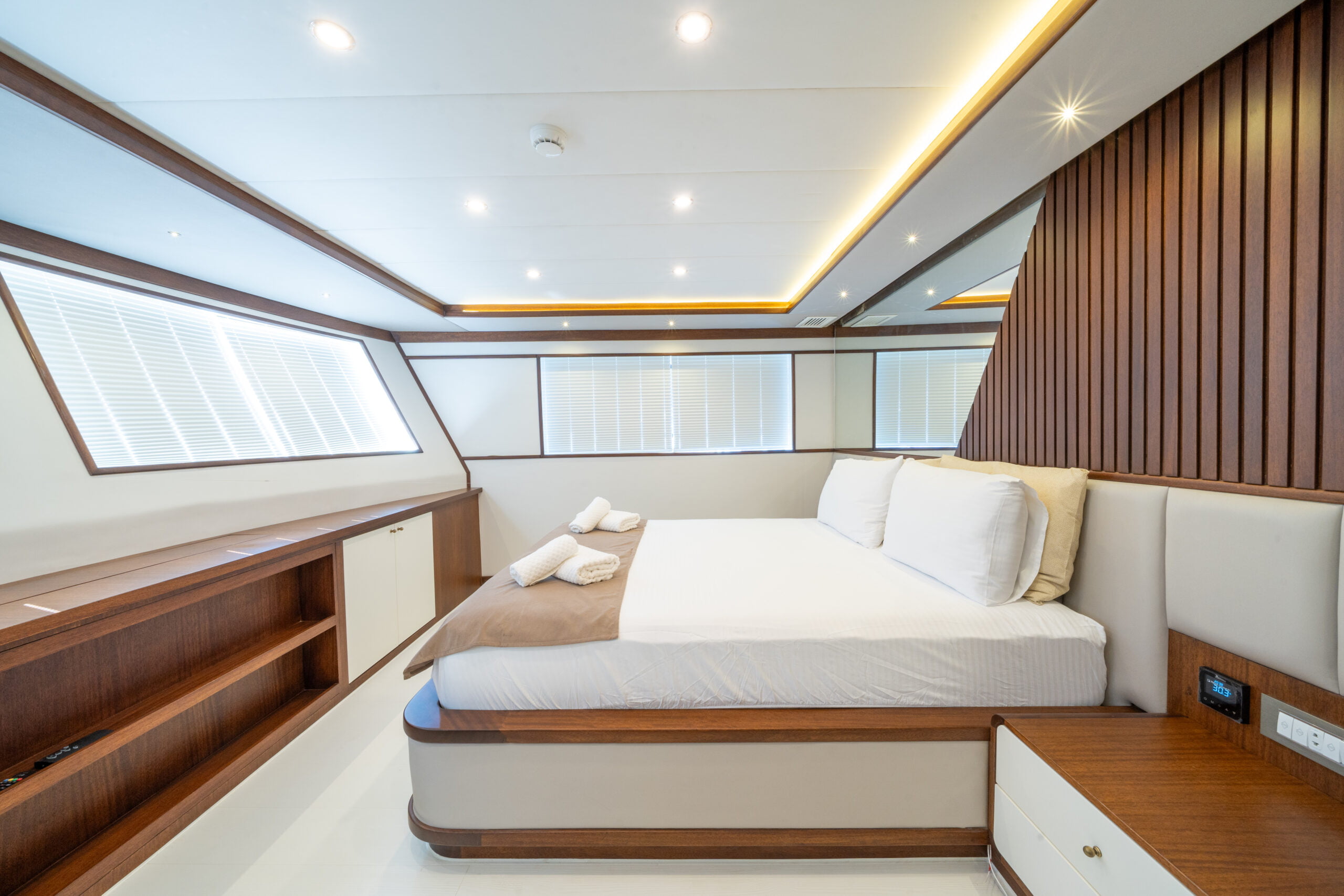 Trawler By C&F is moored in Fethiye harbour and has 4 cabins; 2 masters, 1 triple and 1 twin cabins.